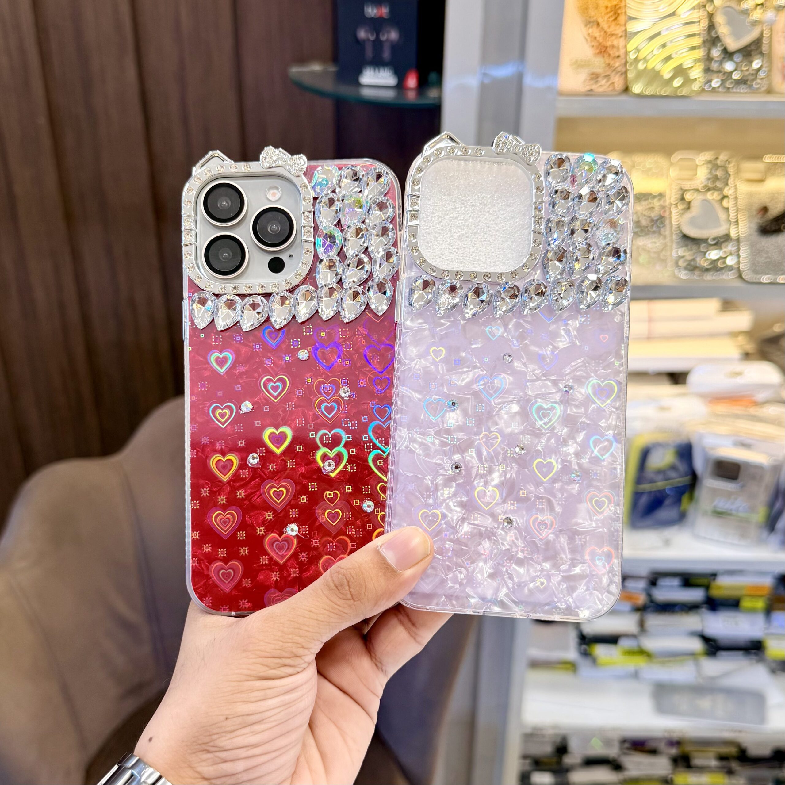 Stone Case With Heart Style Holographic Effect In Silicon Material – iPhone 15