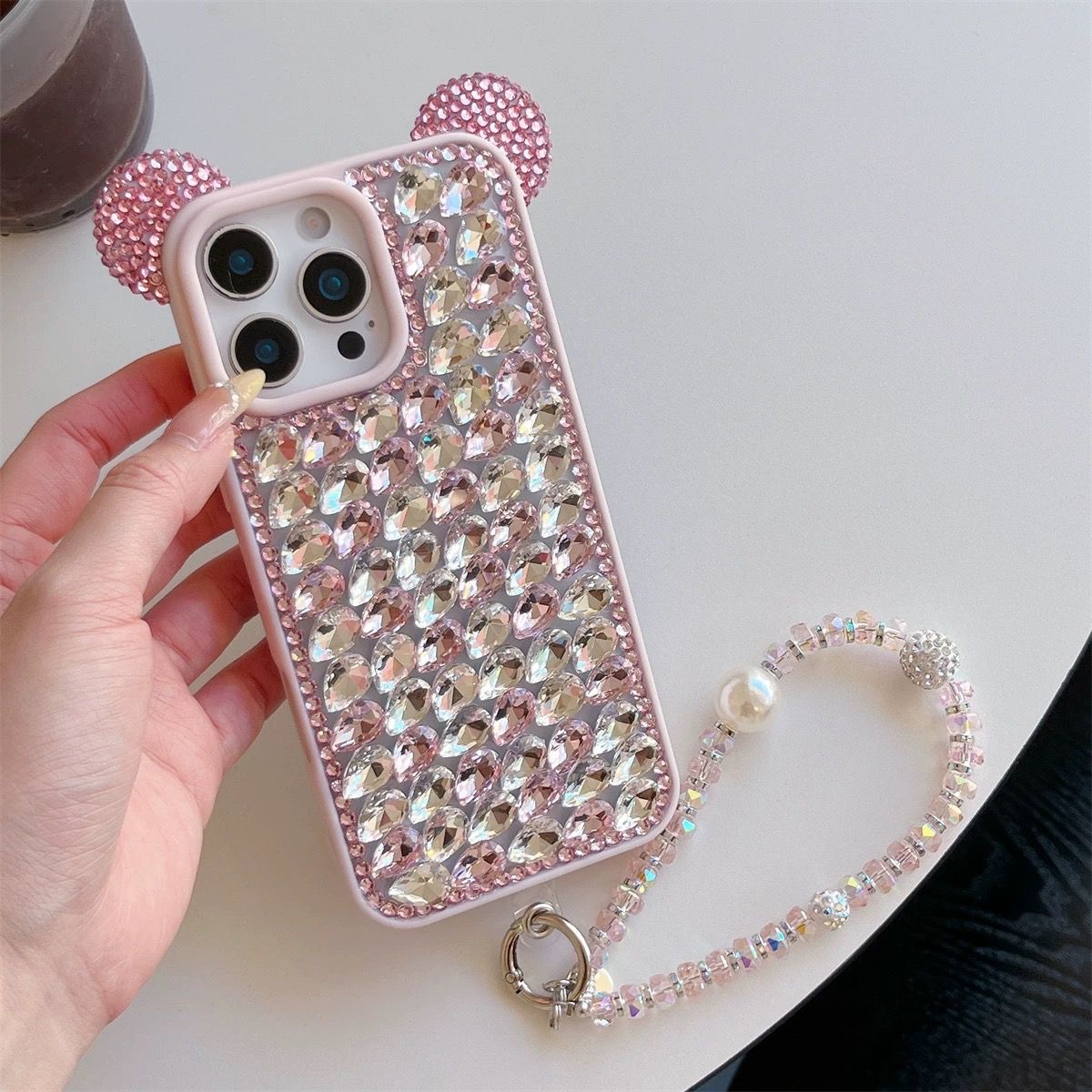 Cute 3D Ears Diamond Case With Charm In Silicon Material (Pink) – iPhone 16 ProMax