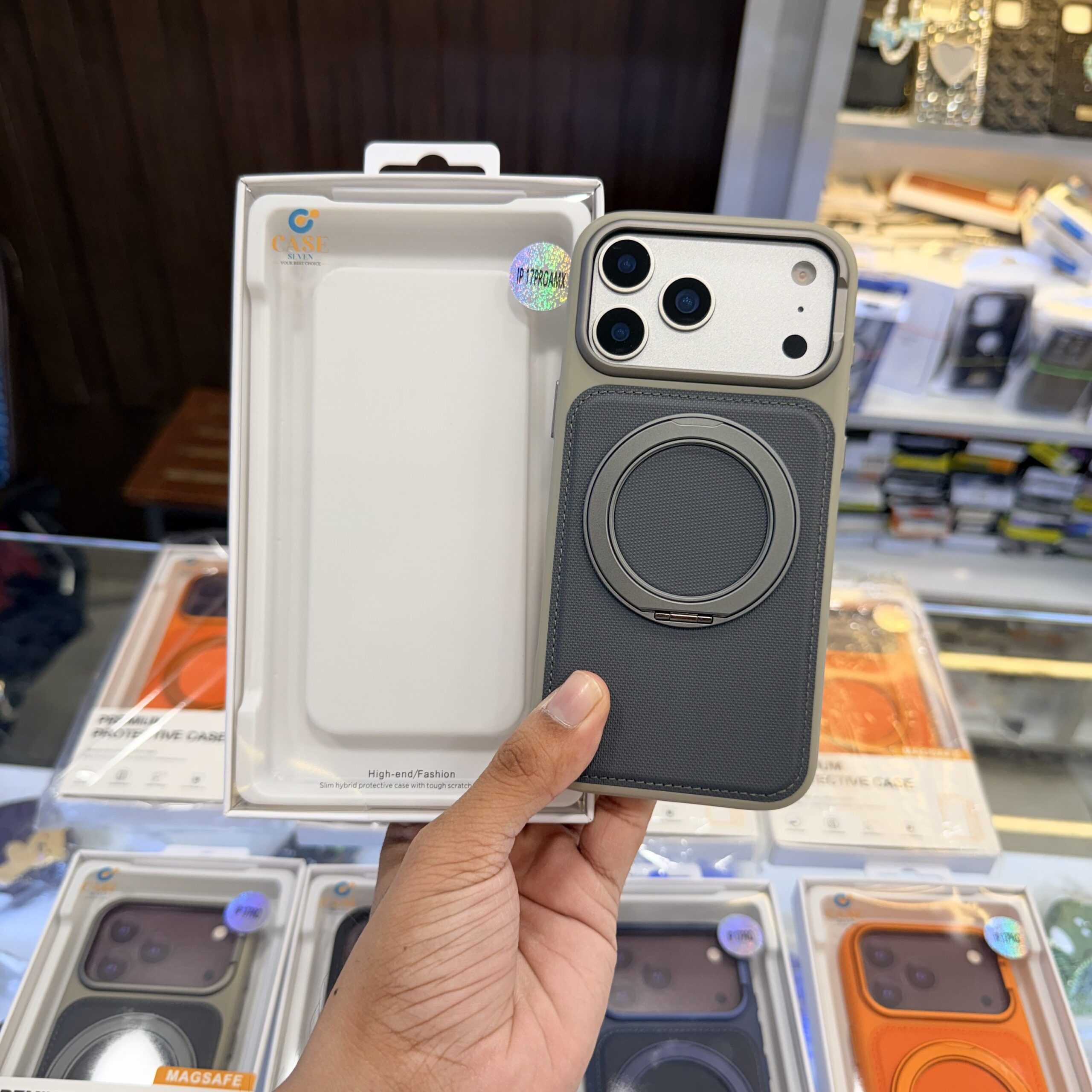 Leather Texture MagSafe Case With 360 Rotating Stand (Silver) – iPhone 17 Pro