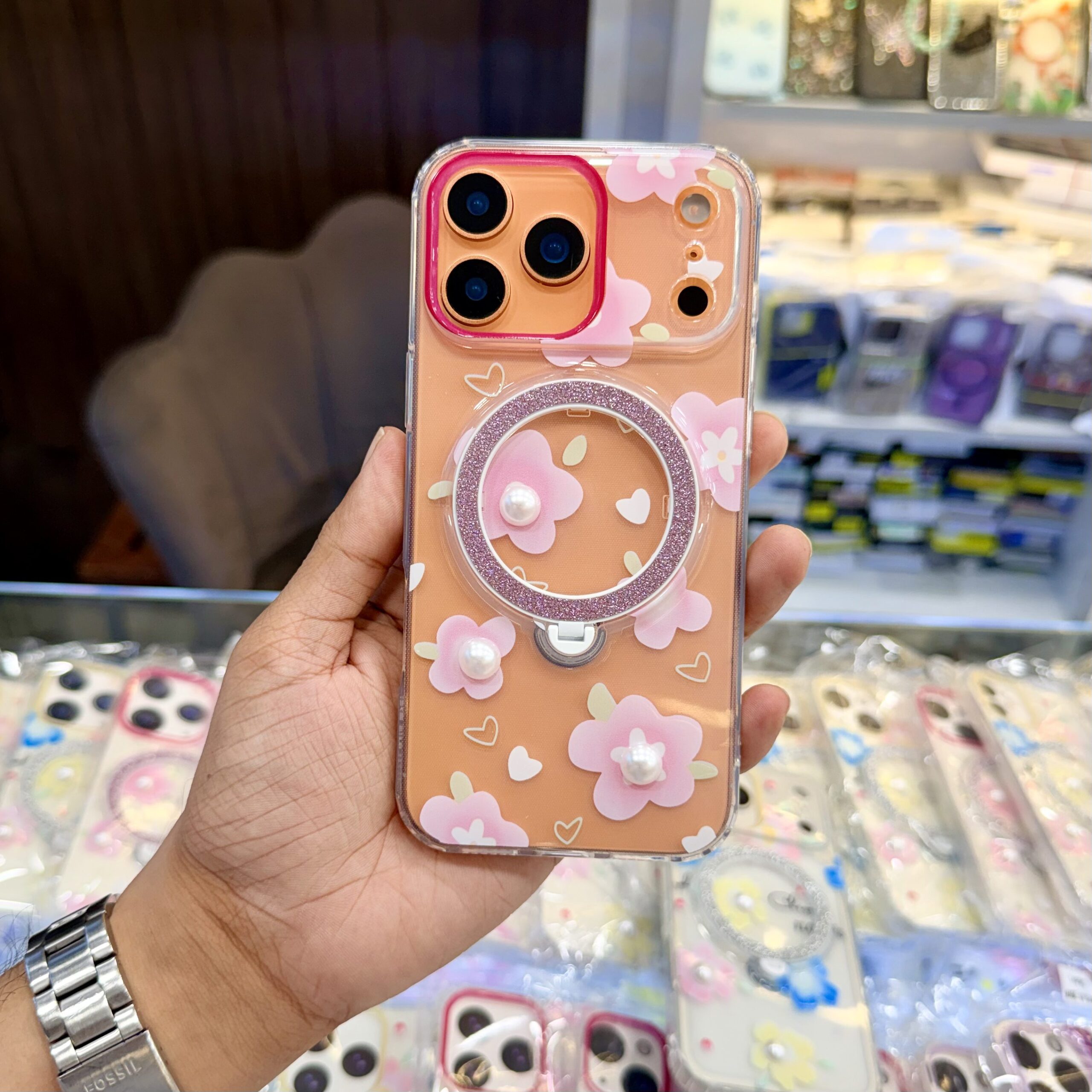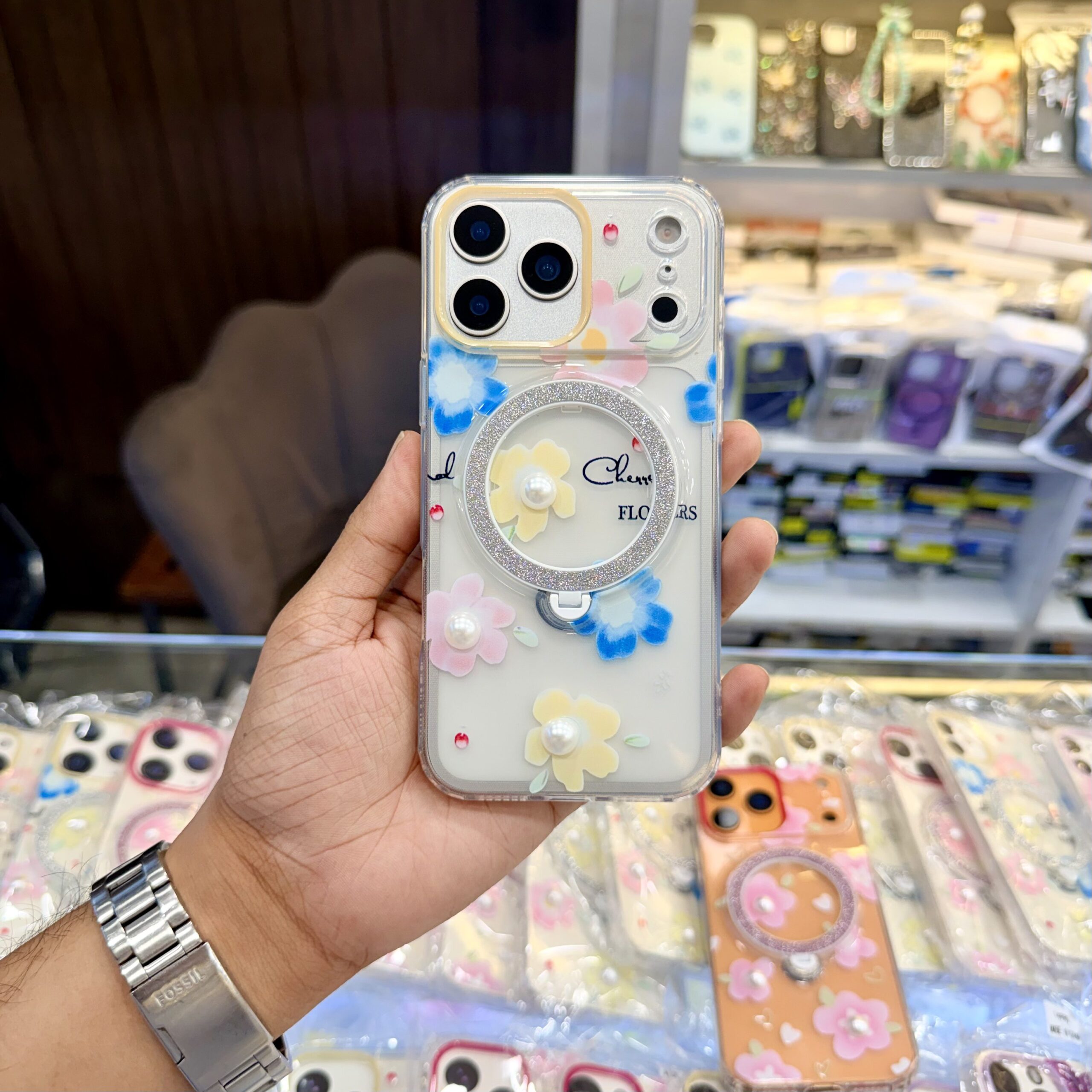 Floral Stone Case With Stand In Silicon Material – iPhone 13 Pro